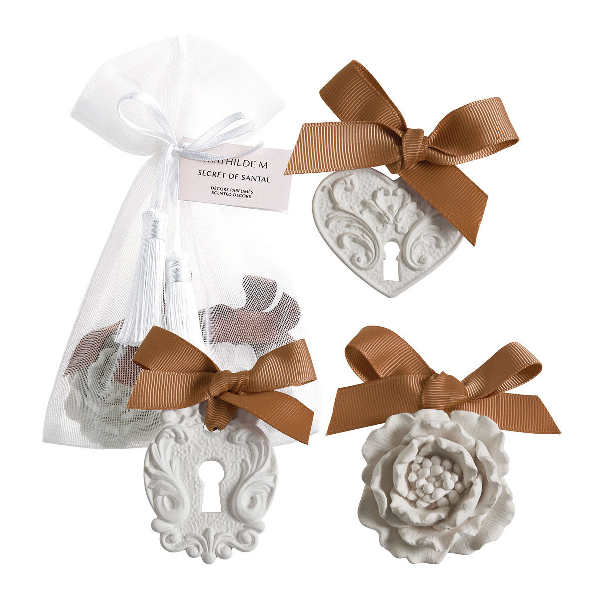 3 decorazioni in gesso (Serratura Segreta, Peonia e Lucchetto cuore), profumo Secret de Santal