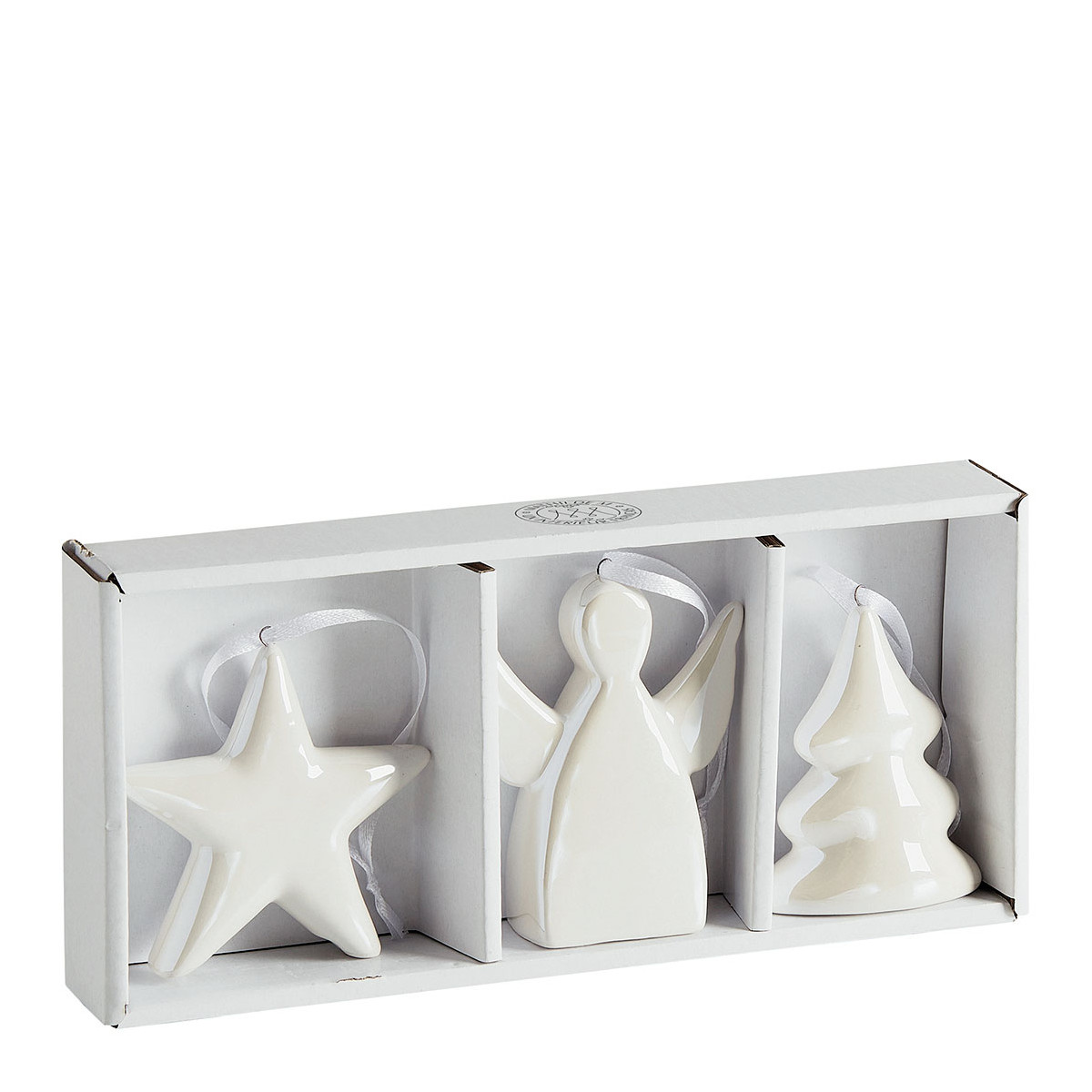 Indispensabile per le festività di fine anno, lasciatevi sedurre da questo set di 3 decorazioni natalizie in ceramica con finitura iridescente. Che le appendiate all'albero, a una maniglia della porta o a una finestra, aggiungeranno un tocco di eleganza e raffinatezza alla decorazione della vostra casa in vista del Natale.nnInformazioni aggiuntivenComposizione: ceramica di colore bianconDimensioni Stella: 8,4 x 8,5 x 1,9 cmnDimensioni Albero: 6,3 x 8,4 x 3,5 cmnDimensioni Angelo: 7,9 x 9 x 3,2 cm