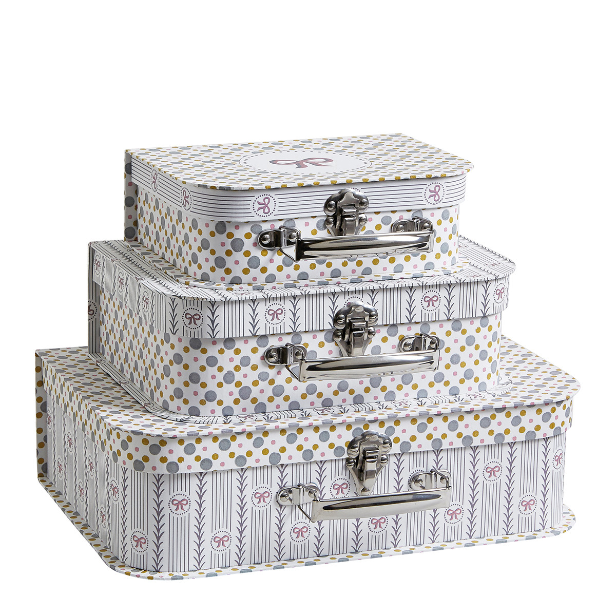 Questo set di 3 valigette ti permetterà di riporre facilmente e con eleganza le cose del bambino. Informazioni aggiuntive Composizione: cartone Modello...