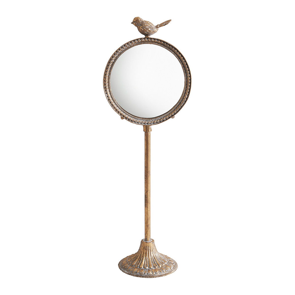 Aggiungi un tocco di romanticismo al tuo interno con questo grazioso specchio da terra con finitura in ottone invecchiato, ornato da un delicato uccellino.nnInformazioni aggiuntive:nnComposizione: metallo con finitura in ottone invecchiato e vetronDimensioni: 13,5 x 40,5 x 9,5 cm