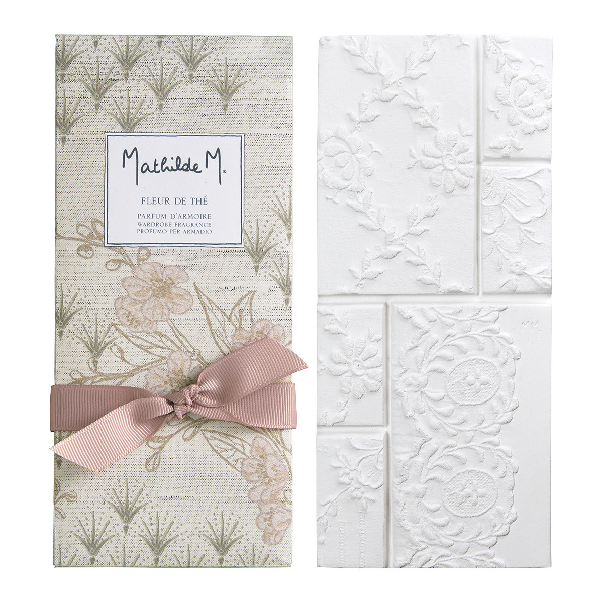 Know-how emblematico del nostro marchio, questa tavoletta in gesso profumato, minuziosamente cesellata a mano, è fabbricata e profumata nei nostri laboratori. Interamente impregnata di profumo, rilascia lentamente e a lungo Fleur de Thé, un profumo dolce e confortante, con note rilassanti di tè bianco e rosa, per un delizioso momento profumato.